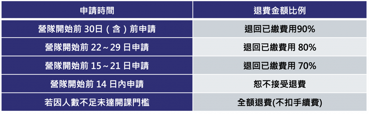 4.若因政府政策導致無法開辦活動,且活動尚未開始,將提供95%的退費(服裝、手冊等不另寄送)。