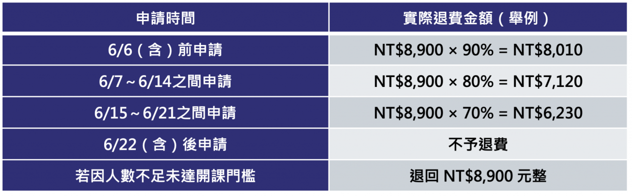 報名繳費後,如因個人因素申請退費,依申請時間退還以下比例費用: